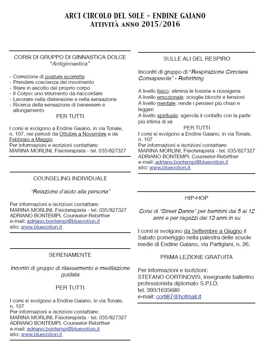 Attività 2015-2016 organizzate dal nostro Circolo del Sole – Endine