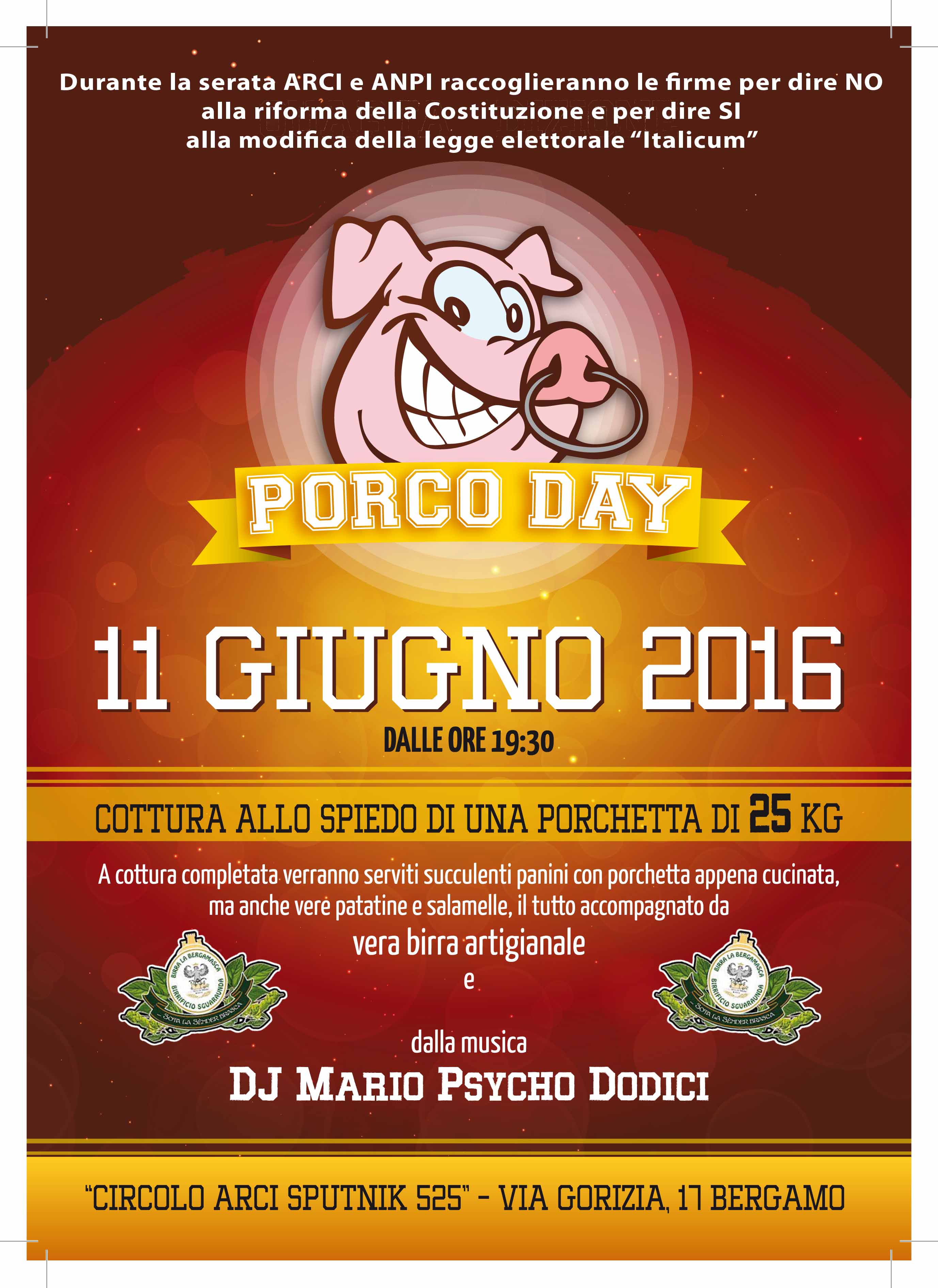 La raccolta firme per dire NO alla riforma della Costituzione e SI’ alla modifica della legge elettorale “Italicum” avverrà sabato sera all’interno dell’iniziativa “Porco day” del circolo Arci Grumello del Piano.