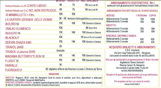 anche quest’anno Arci Bergamo ha stipulato una convenzione con il “Festival Danza Estate” per far sì che i propri soci possano risparmiare e acquistare il biglietto ridotto ai vari spettacoli che vengono proposti.