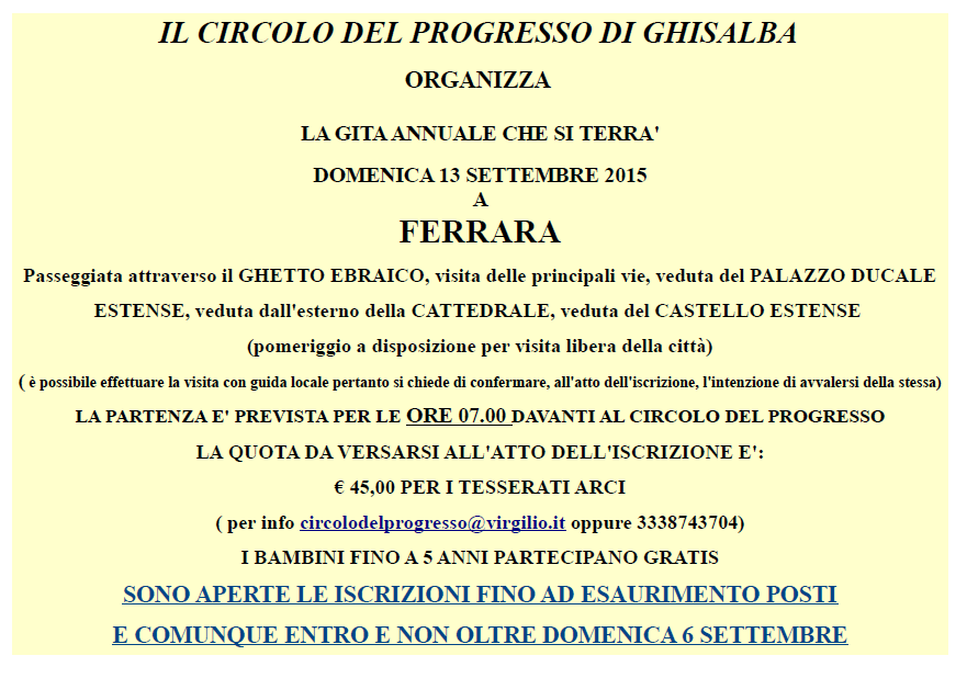 Circolo del Progresso di Ghisalba organizza, Domenica 13 Settembre 2015, la gita Annuale che si terrà a Ferrara. La Partenza è prevista per le ore 07:00 davanti al Circolo dle Progresso; la Quota da versare all’atto dell’iscrizione è di 45€ per i tesserati Arci ( per info scrivete a circolodelprogresso@virgilio.it oppure chiamate il 333-8743704) I BAMBINI FINO A 5 ANNI PARTECIPANO GRATIS.