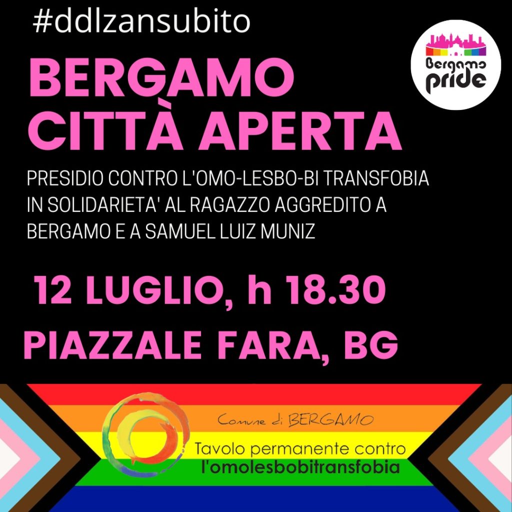 Lunedì 12 luglio, alle ore 18,30, presso il piazzale Fara a Bergamo si terrà il presidio contro l’omo-lesbo-bi transfobia in solidarietà al ragazzo aggredito a Bergamo e a Samuel Luiz Muniz