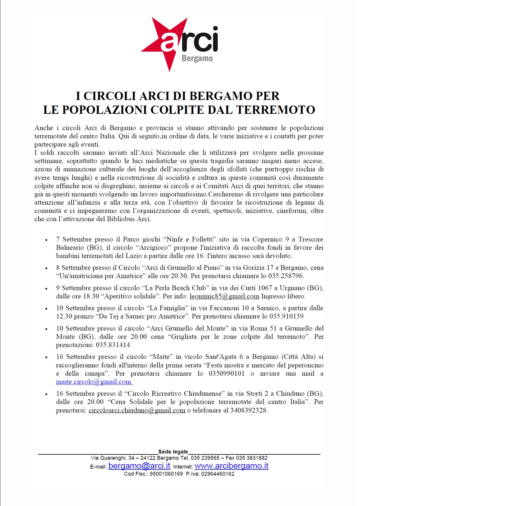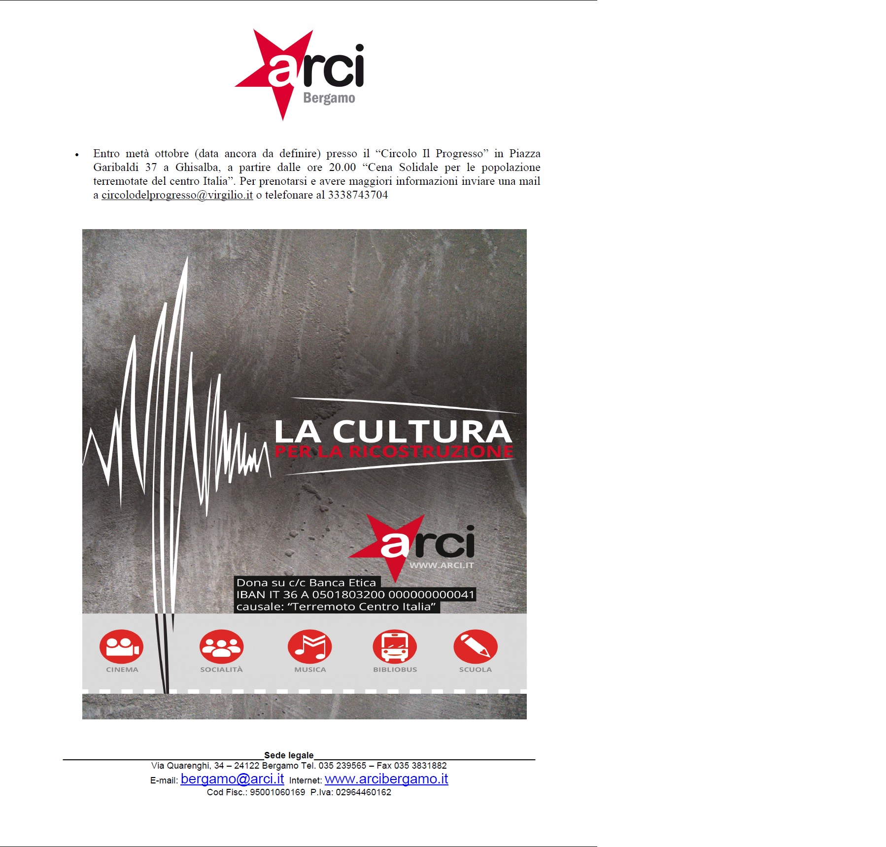 Anche i circoli Arci di Bergamo e provincia si stanno attivando per sostenere le popolazioni terremotate del centro Italia. Qui di seguito il volantino con tutte le iniziative che verranno messe in campo nei prossimi giorni.I soldi raccolti saranno inviati all’Arci nazionale che li utilizzerà per svolgere nelle prossime settimane, soprattutto quando le luci mediatiche su questa tragedia saranno magari meno accese, azioni di animazione culturale dei luoghi dell’accoglienza degli sfollati (che purtroppo rischia di avere tempi lunghi) e nella ricostruzione di socialità e cultura in queste comunità così duramente colpite, insieme ai circoli e ai Comitati Arci di quei territori, che stanno già in questi momenti svolgendo un lavoro importantissimo.