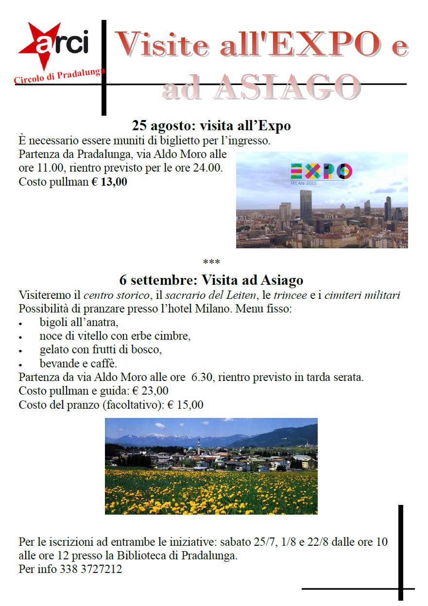 25 Agosto visita all’Expo 2015 06 Settembre visita ad Asiago!